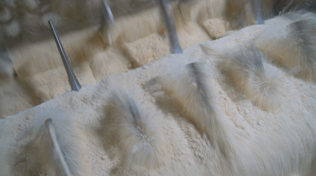 每臺主機的上方都連接著一個大的管道,大的管道里邊是有2根小的管道組成,一根是鹽水管道,一根是面粉管道,面粉和鹽水以霧狀的形式噴灑下來,通過每分鐘1800轉的高速攪拌,充分混合形成面團。